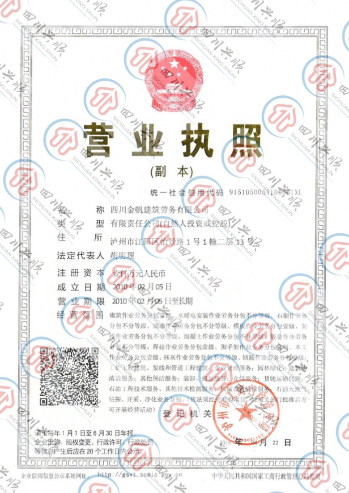 版權所有:四川興順勞務代理有限公司 四川金帆建筑勞務有限公司 公司地址:四川省瀘州市江陽區(qū)怡景路1號1幢二層13號